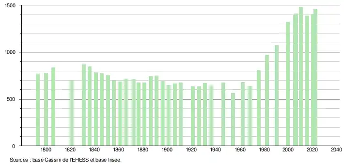 L'évolution du nombre d'habitants est connue à travers les recensements de la population effectués dans la commune depuis 1793. Pour les communes de moins de 10 000 habitants, une enquête de recensement portant sur toute la population est réalisée tous les cinq ans, les populations de référence des années intermédiaires étant quant à elles estimées par interpolation ou extrapolation[28]. Pour la commune, le premier recensement exhaustif entrant dans le cadre du nouveau dispositif a été réalisé en 2005[29].
