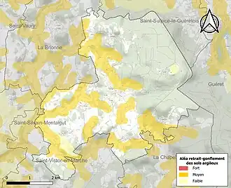 Le retrait-gonflement des sols argileux est susceptible d'engendrer des dommages importants aux bâtiments en cas d’alternance de périodes de sécheresse et de pluie. 28,7 % de la superficie communale est en aléa moyen ou fort (33,6 % au niveau départemental et 48,5 % au niveau national). Sur les 245 bâtiments dénombrés sur la commune en 2019, 58 sont en aléa moyen ou fort, soit 24 %, à comparer aux 25 % au niveau départemental et 54 % au niveau national. Une cartographie de l'exposition du territoire national au retrait gonflement des sols argileux est disponible sur le site du BRGM[13],[Carte 2].
