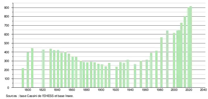L'évolution du nombre d'habitants est connue à travers les recensements de la population effectués dans la commune depuis 1793. Pour les communes de moins de 10 000 habitants, une enquête de recensement portant sur toute la population est réalisée tous les cinq ans, les populations de référence des années intermédiaires étant quant à elles estimées par interpolation ou extrapolation[19]. Pour la commune, le premier recensement exhaustif entrant dans le cadre du nouveau dispositif a été réalisé en 2004[20].