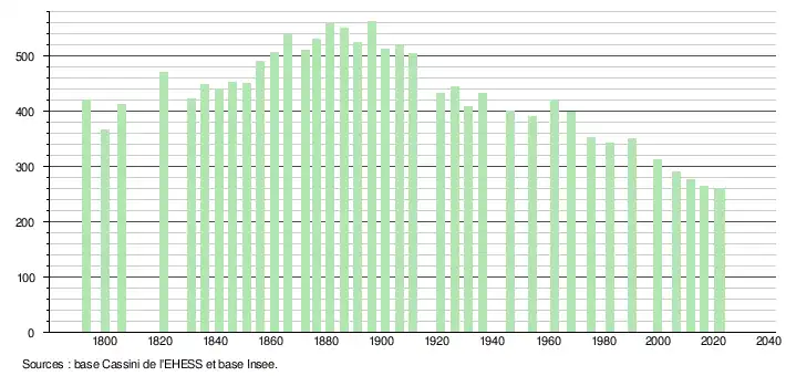 L'évolution du nombre d'habitants est connue à travers les recensements de la population effectués dans la commune depuis 1793. Pour les communes de moins de 10 000 habitants, une enquête de recensement portant sur toute la population est réalisée tous les cinq ans, les populations de référence des années intermédiaires étant quant à elles estimées par interpolation ou extrapolation[17]. Pour la commune, le premier recensement exhaustif entrant dans le cadre du nouveau dispositif a été réalisé en 2006[18].