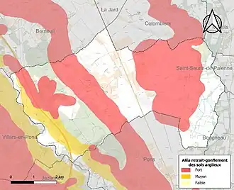 Le retrait-gonflement des sols argileux est susceptible d'engendrer des dommages importants aux bâtiments en cas d’alternance de périodes de sécheresse et de pluie. 52,6 % de la superficie communale est en aléa moyen ou fort (54,2 % au niveau départemental et 48,5 % au niveau national). Sur les 303 bâtiments dénombrés sur la commune en 2019, 260 sont en aléa moyen ou fort, soit 86 %, à comparer aux 57 % au niveau départemental et 54 % au niveau national. Une cartographie de l'exposition du territoire national au retrait gonflement des sols argileux est disponible sur le site du BRGM[13],[Carte 2].