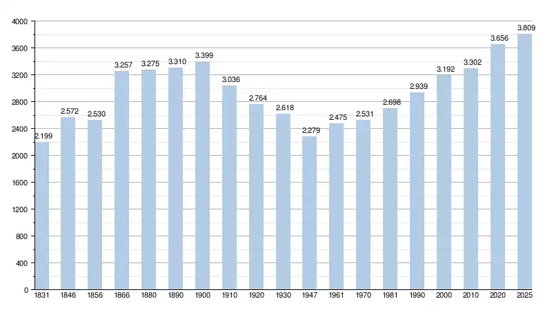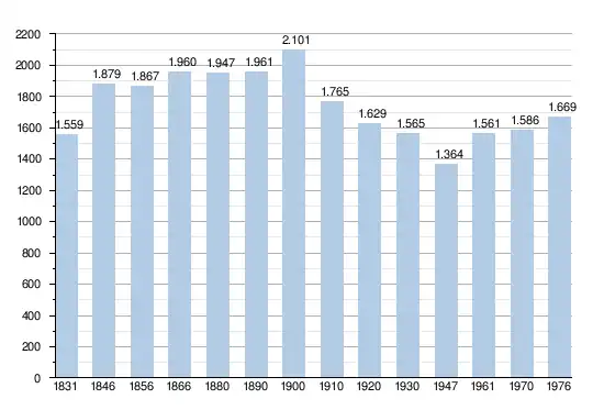 Les chiffres des années 1831 à 1970 tiennent compte des chiffres des anciennes communes fusionnées.