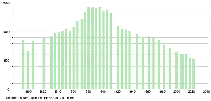 L'évolution du nombre d'habitants est connue à travers les recensements de la population effectués dans la commune depuis 1793. Pour les communes de moins de 10 000 habitants, une enquête de recensement portant sur toute la population est réalisée tous les cinq ans, les populations de référence des années intermédiaires étant quant à elles estimées par interpolation ou extrapolation[57]. Pour la commune, le premier recensement exhaustif entrant dans le cadre du nouveau dispositif a été réalisé en 2007[58].