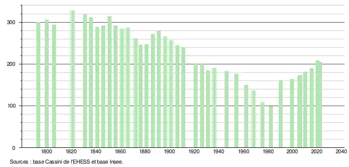 L'évolution du nombre d'habitants est connue à travers les recensements de la population effectués dans la commune depuis 1793. Pour les communes de moins de 10 000 habitants, une enquête de recensement portant sur toute la population est réalisée tous les cinq ans, les populations de référence des années intermédiaires étant quant à elles estimées par interpolation ou extrapolation[34]. Pour la commune, le premier recensement exhaustif entrant dans le cadre du nouveau dispositif a été réalisé en 2005[35].