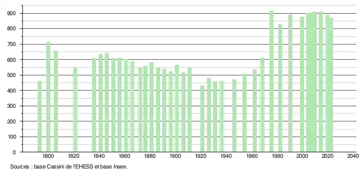 L'évolution du nombre d'habitants est connue à travers les recensements de la population effectués dans la commune depuis 1793. Pour les communes de moins de 10 000 habitants, une enquête de recensement portant sur toute la population est réalisée tous les cinq ans, les populations de référence des années intermédiaires étant quant à elles estimées par interpolation ou extrapolation[26]. Pour la commune, le premier recensement exhaustif entrant dans le cadre du nouveau dispositif a été réalisé en 2004[27].