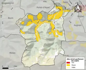 Les mouvements de terrains susceptibles de se produire sur la commune sont soit des chutes de blocs, soit des glissements de terrains, soit des effondrements liés à des cavités souterraines, soit des mouvements liés au retrait-gonflement des argiles. Près de 50 % de la superficie du département est concernée par l'aléa retrait-gonflement des argiles, dont la commune de Saint-Lary[39]. L'inventaire national des cavités souterraines permet par ailleurs de localiser celles situées sur la commune[40].