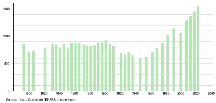 L'évolution du nombre d'habitants est connue à travers les recensements de la population effectués dans la commune depuis 1793. Pour les communes de moins de 10 000 habitants, une enquête de recensement portant sur toute la population est réalisée tous les cinq ans, les populations de référence des années intermédiaires étant quant à elles estimées par interpolation ou extrapolation[24]. Pour la commune, le premier recensement exhaustif entrant dans le cadre du nouveau dispositif a été réalisé en 2007[25].