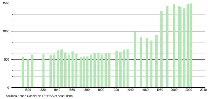 L'évolution du nombre d'habitants est connue à travers les recensements de la population effectués dans la commune depuis 1793. Pour les communes de moins de 10 000 habitants, une enquête de recensement portant sur toute la population est réalisée tous les cinq ans, les populations de référence des années intermédiaires étant quant à elles estimées par interpolation ou extrapolation[27]. Pour la commune, le premier recensement exhaustif entrant dans le cadre du nouveau dispositif a été réalisé en 2008[28].
