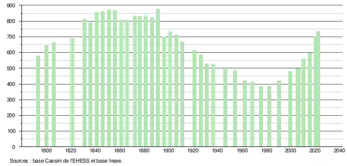 | L'évolution du nombre d'habitants est connue à travers les recensements de la population effectués dans la commune depuis 1793. Pour les communes de moins de 10 000 habitants, une enquête de recensement portant sur toute la population est réalisée tous les cinq ans, les populations de référence des années intermédiaires étant quant à elles estimées par interpolation ou extrapolation[27]. Pour la commune, le premier recensement exhaustif entrant dans le cadre du nouveau dispositif a été réalisé en 2005[28]. En 2022, la commune comptait 735 habitants[Note 3], en évolution de +21,89 % par rapport à 2016 (Landes : +5,78 %, France hors Mayotte : +2,11 %). |