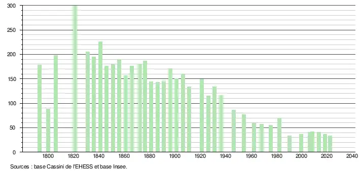 L'évolution du nombre d'habitants est connue à travers les recensements de la population effectués dans la commune depuis 1793. Pour les communes de moins de 10 000 habitants, une enquête de recensement portant sur toute la population est réalisée tous les cinq ans, les populations de référence des années intermédiaires étant quant à elles estimées par interpolation ou extrapolation[21]. Pour la commune, le premier recensement exhaustif entrant dans le cadre du nouveau dispositif a été réalisé en 2008[22].