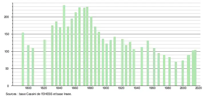 L'évolution du nombre d'habitants est connue à travers les recensements de la population effectués dans la commune depuis 1793. Pour les communes de moins de 10 000 habitants, une enquête de recensement portant sur toute la population est réalisée tous les cinq ans, les populations de référence des années intermédiaires étant quant à elles estimées par interpolation ou extrapolation[5]. Pour la commune, le premier recensement exhaustif entrant dans le cadre du nouveau dispositif a été réalisé en 2007[6].