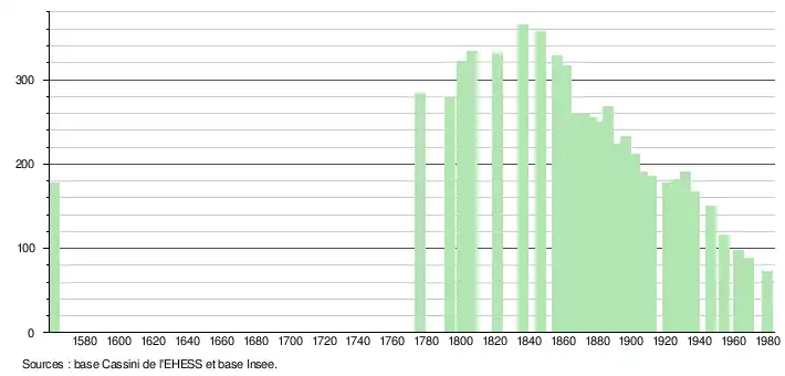 L'évolution du nombre d'habitants est connue à travers les recensements de la population effectués dans la commune depuis 1561. Pour les communes de moins de 10 000 habitants, une enquête de recensement portant sur toute la population est réalisée tous les cinq ans, les populations de référence des années intermédiaires étant quant à elles estimées par interpolation ou extrapolation[6]. Pour la commune, le premier recensement exhaustif entrant dans le cadre du nouveau dispositif a été réalisé en 2008[7].