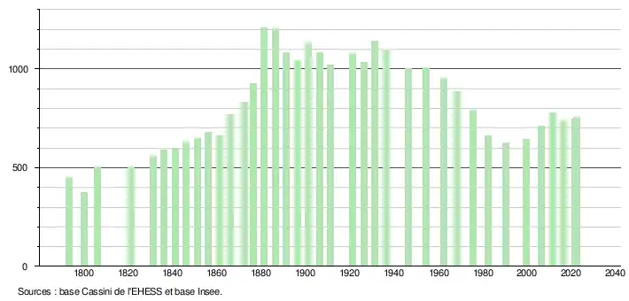 | L'évolution du nombre d'habitants est connue à travers les recensements de la population effectués dans la commune depuis 1793. Pour les communes de moins de 10 000 habitants, une enquête de recensement portant sur toute la population est réalisée tous les cinq ans, les populations de référence des années intermédiaires étant quant à elles estimées par interpolation ou extrapolation[32]. Pour la commune, le premier recensement exhaustif entrant dans le cadre du nouveau dispositif a été réalisé en 2006[33]. En 2022, la commune comptait 757 habitants[Note 5], en évolution de +2,57 % par rapport à 2016 (Aude : +2,65 %, France hors Mayotte : +2,11 %). |