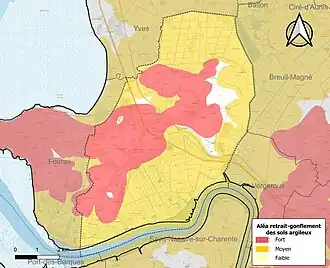 Le retrait-gonflement des sols argileux est susceptible d'engendrer des dommages importants aux bâtiments en cas d’alternance de périodes de sécheresse et de pluie. 93,9 % de la superficie communale est en aléa moyen ou fort (54,2 % au niveau départemental et 48,5 % au niveau national). Sur les 1 097 bâtiments dénombrés sur la commune en 2019, 1 082 sont en aléa moyen ou fort, soit 99 %, à comparer aux 57 % au niveau départemental et 54 % au niveau national. Une cartographie de l'exposition du territoire national au retrait gonflement des sols argileux est disponible sur le site du BRGM[18],[Carte 2].