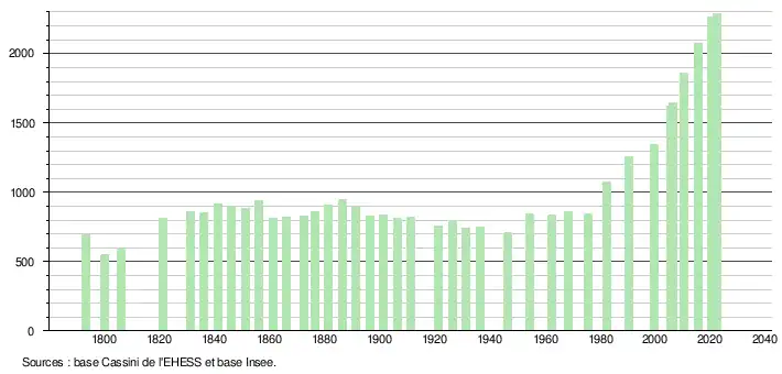 L'évolution du nombre d'habitants est connue à travers les recensements de la population effectués dans la commune depuis 1793. Pour les communes de moins de 10 000 habitants, une enquête de recensement portant sur toute la population est réalisée tous les cinq ans, les populations de référence des années intermédiaires étant quant à elles estimées par interpolation ou extrapolation[23]. Pour la commune, le premier recensement exhaustif entrant dans le cadre du nouveau dispositif a été réalisé en 2005[24].