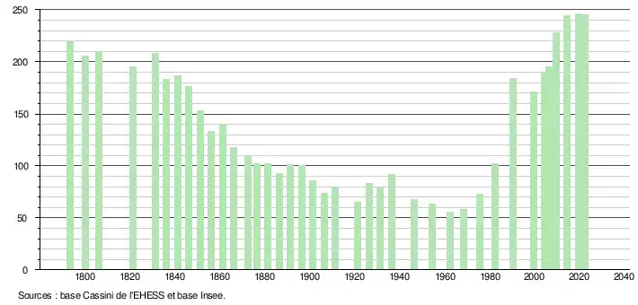L'évolution du nombre d'habitants est connue à travers les recensements de la population effectués dans la commune depuis 1793. Pour les communes de moins de 10 000 habitants, une enquête de recensement portant sur toute la population est réalisée tous les cinq ans, les populations de référence des années intermédiaires étant quant à elles estimées par interpolation ou extrapolation[17]. Pour la commune, le premier recensement exhaustif entrant dans le cadre du nouveau dispositif a été réalisé en 2004[18].