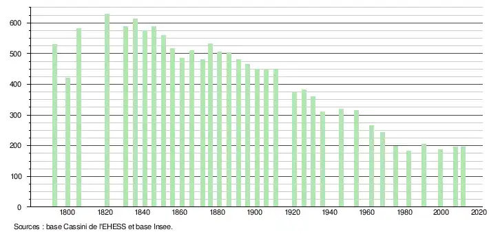 - ↑ Dans le tableau des recensements et le graphique, par convention dans Wikipédia, le principe a été retenu, pour les populations légales postérieures à 1999 de n’afficher dans le tableau des recensements et le graphique que les populations correspondant à l'année 2006, première population légale publiée calculée conformément aux concepts définis dans le décret no 2003-485 du 5 juin 2003, et les années correspondant à une enquête exhaustive de recensement pour les communes de moins de 10 000 habitants, ainsi que la dernière population légale publiée par l’Insee.