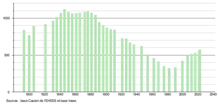 L'évolution du nombre d'habitants est connue à travers les recensements de la population effectués dans la commune depuis 1793. Pour les communes de moins de 10 000 habitants, une enquête de recensement portant sur toute la population est réalisée tous les cinq ans, les populations de référence des années intermédiaires étant quant à elles estimées par interpolation ou extrapolation[21]. Pour la commune, le premier recensement exhaustif entrant dans le cadre du nouveau dispositif a été réalisé en 2006[22].