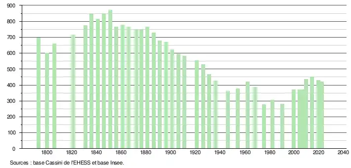 L'évolution du nombre d'habitants est connue à travers les recensements de la population effectués dans la commune depuis 1793. Pour les communes de moins de 10 000 habitants, une enquête de recensement portant sur toute la population est réalisée tous les cinq ans, les populations de référence des années intermédiaires étant quant à elles estimées par interpolation ou extrapolation[16]. Pour la commune, le premier recensement exhaustif entrant dans le cadre du nouveau dispositif a été réalisé en 2004[17].