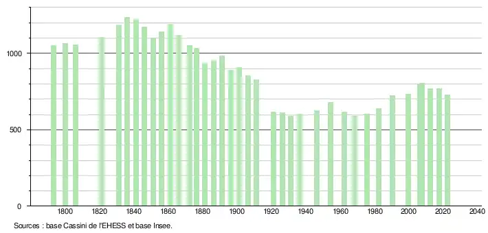 L'évolution du nombre d'habitants est connue à travers les recensements de la population effectués dans la commune depuis 1793. Pour les communes de moins de 10 000 habitants, une enquête de recensement portant sur toute la population est réalisée tous les cinq ans, les populations de référence des années intermédiaires étant quant à elles estimées par interpolation ou extrapolation[21]. Pour la commune, le premier recensement exhaustif entrant dans le cadre du nouveau dispositif a été réalisé en 2007[22].
