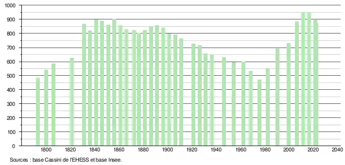 L'évolution du nombre d'habitants est connue à travers les recensements de la population effectués dans la commune depuis 1793. Pour les communes de moins de 10 000 habitants, une enquête de recensement portant sur toute la population est réalisée tous les cinq ans, les populations de référence des années intermédiaires étant quant à elles estimées par interpolation ou extrapolation[28]. Pour la commune, le premier recensement exhaustif entrant dans le cadre du nouveau dispositif a été réalisé en 2006[29].