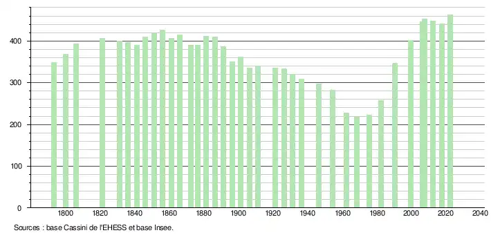L'évolution du nombre d'habitants est connue à travers les recensements de la population effectués dans la commune depuis 1793. Pour les communes de moins de 10 000 habitants, une enquête de recensement portant sur toute la population est réalisée tous les cinq ans, les populations de référence des années intermédiaires étant quant à elles estimées par interpolation ou extrapolation[21]. Pour la commune, le premier recensement exhaustif entrant dans le cadre du nouveau dispositif a été réalisé en 2007[22].
