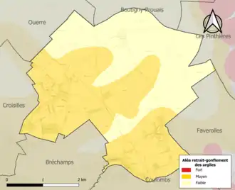 Le retrait-gonflement des sols argileux est susceptible d'engendrer des dommages importants aux bâtiments en cas d’alternance de périodes de sécheresse et de pluie. 57,5 % de la superficie communale est en aléa moyen ou fort (52,8 % au niveau départemental et 48,5 % au niveau national). Sur les 225 bâtiments dénombrés sur la commune en 2019, 219 sont en aléa moyen ou fort, soit 97 %, à comparer aux 70 % au niveau départemental et 54 % au niveau national. Une cartographie de l'exposition du territoire national au retrait gonflement des sols argileux est disponible sur le site du BRGM[15],[Carte 2].