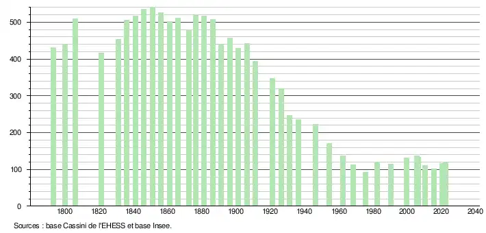 L'évolution du nombre d'habitants est connue à travers les recensements de la population effectués dans la commune depuis 1793. Pour les communes de moins de 10 000 habitants, une enquête de recensement portant sur toute la population est réalisée tous les cinq ans, les populations de référence des années intermédiaires étant quant à elles estimées par interpolation ou extrapolation[15]. Pour la commune, le premier recensement exhaustif entrant dans le cadre du nouveau dispositif a été réalisé en 2005[16].