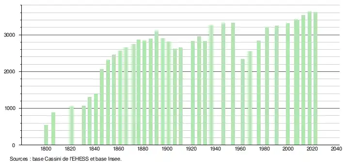L'évolution du nombre d'habitants est connue à travers les recensements de la population effectués dans la commune depuis 1800. Pour les communes de moins de 10 000 habitants, une enquête de recensement portant sur toute la population est réalisée tous les cinq ans, les populations de référence des années intermédiaires étant quant à elles estimées par interpolation ou extrapolation[24]. Pour la commune, le premier recensement exhaustif entrant dans le cadre du nouveau dispositif a été réalisé en 2007[25].
