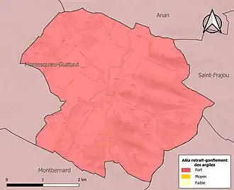 Le retrait-gonflement des sols argileux est susceptible d'engendrer des dommages importants aux bâtiments en cas d’alternance de périodes de sécheresse et de pluie. La totalité de la commune est en aléa moyen ou fort (88,8% au niveau départemental et 48,5% au niveau national). Sur les 132 bâtiments dénombrés sur la commune en 2019, 132 sont en aléa moyen ou fort, soit 100%, à comparer aux 98% au niveau départemental et 54% au niveau national. Une cartographie de l'exposition du territoire national au retrait gonflement des sols argileux est disponible sur le site du BRGM[24],[Carte 3].