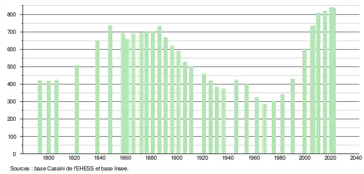 L'évolution du nombre d'habitants est connue à travers les recensements de la population effectués dans la commune depuis 1793. Pour les communes de moins de 10 000 habitants, une enquête de recensement portant sur toute la population est réalisée tous les cinq ans, les populations de référence des années intermédiaires étant quant à elles estimées par interpolation ou extrapolation[14]. Pour la commune, le premier recensement exhaustif entrant dans le cadre du nouveau dispositif a été réalisé en 2005[15].
