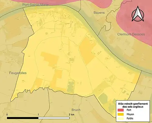 Le retrait-gonflement des sols argileux est susceptible d'engendrer des dommages importants aux bâtiments en cas d’alternance de périodes de sécheresse et de pluie[19]. La totalité de la commune est en aléa moyen ou fort (91,8 % au niveau départemental et 48,5 % au niveau national)[Carte 2]. Depuis le , en application de la loi ELAN, différentes contraintes s'imposent aux vendeurs, maîtres d'ouvrages ou constructeurs de biens situés dans une zone classée en aléa moyen ou fort[Note 5],[20].