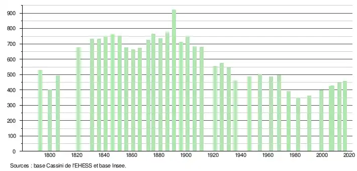 L'évolution du nombre d'habitants est connue à travers les recensements de la population effectués dans la commune depuis 1793. Pour les communes de moins de 10 000 habitants, une enquête de recensement portant sur toute la population est réalisée tous les cinq ans, les populations de référence des années intermédiaires étant quant à elles estimées par interpolation ou extrapolation[7]. Pour la commune, le premier recensement exhaustif entrant dans le cadre du nouveau dispositif a été réalisé en 2007[8].
