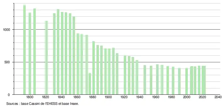 | L'évolution du nombre d'habitants est connue à travers les recensements de la population effectués dans la commune depuis 1793. Pour les communes de moins de 10 000 habitants, une enquête de recensement portant sur toute la population est réalisée tous les cinq ans, les populations de référence des années intermédiaires étant quant à elles estimées par interpolation ou extrapolation[19]. Pour la commune, le premier recensement exhaustif entrant dans le cadre du nouveau dispositif a été réalisé en 2005[20]. En 2022, la commune comptait 441 habitants[Note 2], en évolution de −0,45 % par rapport à 2016 (Landes : +5,78 %, France hors Mayotte : +2,11 %). |