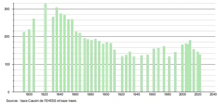 L'évolution du nombre d'habitants est connue à travers les recensements de la population effectués dans la commune depuis 1793. Pour les communes de moins de 10 000 habitants, une enquête de recensement portant sur toute la population est réalisée tous les cinq ans, les populations de référence des années intermédiaires étant quant à elles estimées par interpolation ou extrapolation[25]. Pour la commune, le premier recensement exhaustif entrant dans le cadre du nouveau dispositif a été réalisé en 2004[26].