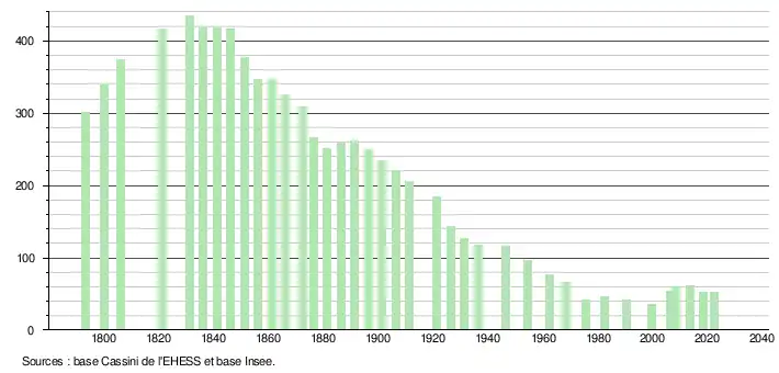 L'évolution du nombre d'habitants est connue à travers les recensements de la population effectués dans la commune depuis 1793. Pour les communes de moins de 10 000 habitants, une enquête de recensement portant sur toute la population est réalisée tous les cinq ans, les populations de référence des années intermédiaires étant quant à elles estimées par interpolation ou extrapolation[31]. Pour la commune, le premier recensement exhaustif entrant dans le cadre du nouveau dispositif a été réalisé en 2008[32].