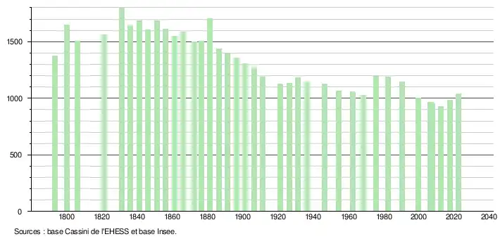 L'évolution du nombre d'habitants est connue à travers les recensements de la population effectués dans la commune depuis 1793. Pour les communes de moins de 10 000 habitants, une enquête de recensement portant sur toute la population est réalisée tous les cinq ans, les populations de référence des années intermédiaires étant quant à elles estimées par interpolation ou extrapolation[27]. Pour la commune, le premier recensement exhaustif entrant dans le cadre du nouveau dispositif a été réalisé en 2007[28].