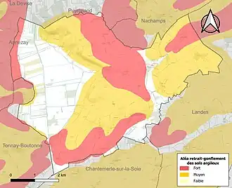 Le retrait-gonflement des sols argileux est susceptible d'engendrer des dommages importants aux bâtiments en cas d’alternance de périodes de sécheresse et de pluie. 68,6 % de la superficie communale est en aléa moyen ou fort (54,2 % au niveau départemental et 48,5 % au niveau national). Sur les 190 bâtiments dénombrés sur la commune en 2019, 152 sont en aléa moyen ou fort, soit 80 %, à comparer aux 57 % au niveau départemental et 54 % au niveau national. Une cartographie de l'exposition du territoire national au retrait gonflement des sols argileux est disponible sur le site du BRGM[15],[Carte 2].