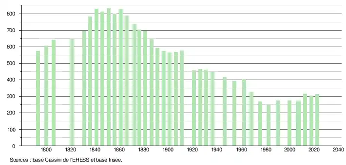 L'évolution du nombre d'habitants est connue à travers les recensements de la population effectués dans la commune depuis 1793. Pour les communes de moins de 10 000 habitants, une enquête de recensement portant sur toute la population est réalisée tous les cinq ans, les populations de référence des années intermédiaires étant quant à elles estimées par interpolation ou extrapolation[24]. Pour la commune, le premier recensement exhaustif entrant dans le cadre du nouveau dispositif a été réalisé en 2007[25].