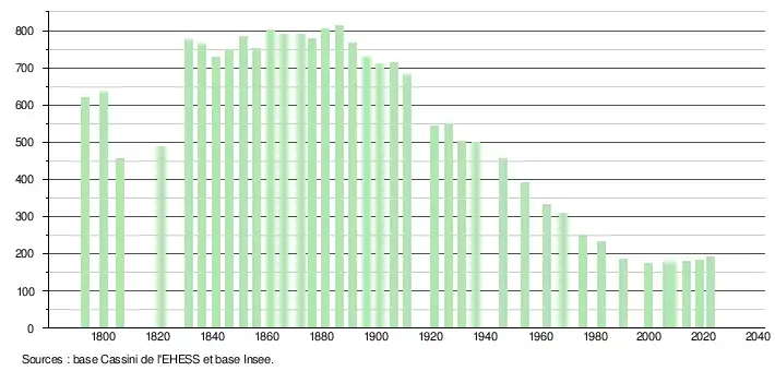 L'évolution du nombre d'habitants est connue à travers les recensements de la population effectués dans la commune depuis 1793. Pour les communes de moins de 10 000 habitants, une enquête de recensement portant sur toute la population est réalisée tous les cinq ans, les populations de référence des années intermédiaires étant quant à elles estimées par interpolation ou extrapolation[30]. Pour la commune, le premier recensement exhaustif entrant dans le cadre du nouveau dispositif a été réalisé en 2008[31].