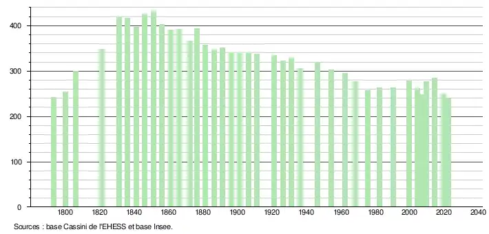 L'évolution du nombre d'habitants est connue à travers les recensements de la population effectués dans la commune depuis 1793. Pour les communes de moins de 10 000 habitants, une enquête de recensement portant sur toute la population est réalisée tous les cinq ans, les populations de référence des années intermédiaires étant quant à elles estimées par interpolation ou extrapolation[14]. Pour la commune, le premier recensement exhaustif entrant dans le cadre du nouveau dispositif a été réalisé en 2004[15].