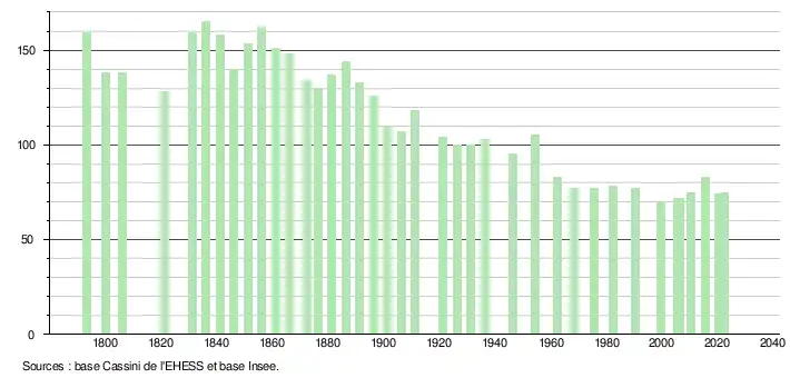 L'évolution du nombre d'habitants est connue à travers les recensements de la population effectués dans la commune depuis 1793. Pour les communes de moins de 10 000 habitants, une enquête de recensement portant sur toute la population est réalisée tous les cinq ans, les populations de référence des années intermédiaires étant quant à elles estimées par interpolation ou extrapolation[20]. Pour la commune, le premier recensement exhaustif entrant dans le cadre du nouveau dispositif a été réalisé en 2005[21].