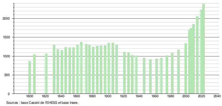 L'évolution du nombre d'habitants est connue à travers les recensements de la population effectués dans la commune depuis 1800. Pour les communes de moins de 10 000 habitants, une enquête de recensement portant sur toute la population est réalisée tous les cinq ans, les populations de référence des années intermédiaires étant quant à elles estimées par interpolation ou extrapolation[31]. Pour la commune, le premier recensement exhaustif entrant dans le cadre du nouveau dispositif a été réalisé en 2004[32].