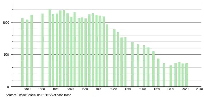 L'évolution du nombre d'habitants est connue à travers les recensements de la population effectués dans la commune depuis 1793. Pour les communes de moins de 10 000 habitants, une enquête de recensement portant sur toute la population est réalisée tous les cinq ans, les populations de référence des années intermédiaires étant quant à elles estimées par interpolation ou extrapolation[24]. Pour la commune, le premier recensement exhaustif entrant dans le cadre du nouveau dispositif a été réalisé en 2006[25].