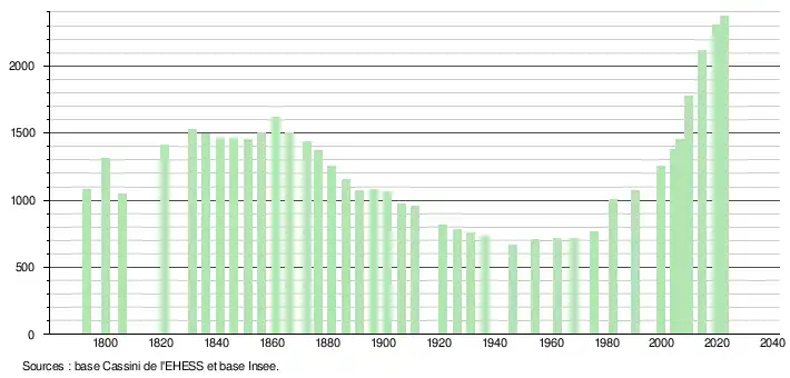 L'évolution du nombre d'habitants est connue à travers les recensements de la population effectués dans la commune depuis 1793. Pour les communes de moins de 10 000 habitants, une enquête de recensement portant sur toute la population est réalisée tous les cinq ans, les populations de référence des années intermédiaires étant quant à elles estimées par interpolation ou extrapolation[16]. Pour la commune, le premier recensement exhaustif entrant dans le cadre du nouveau dispositif a été réalisé en 2004[17].