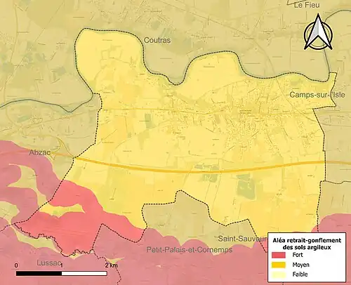 Le retrait-gonflement des sols argileux est susceptible d'engendrer des dommages importants aux bâtiments en cas d’alternance de périodes de sécheresse et de pluie. La totalité de la commune est en aléa moyen ou fort (67,4 % au niveau départemental et 48,5 % au niveau national). Sur les 1 158 bâtiments dénombrés sur la commune en 2019, 1 158 sont en aléa moyen ou fort, soit 100 %, à comparer aux 84 % au niveau départemental et 54 % au niveau national. Une cartographie de l'exposition du territoire national au retrait gonflement des sols argileux est disponible sur le site du BRGM[19],[Carte 2].