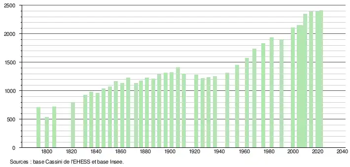 L'évolution du nombre d'habitants est connue à travers les recensements de la population effectués dans la commune depuis 1793. Pour les communes de moins de 10 000 habitants, une enquête de recensement portant sur toute la population est réalisée tous les cinq ans, les populations de référence des années intermédiaires étant quant à elles estimées par interpolation ou extrapolation[25]. Pour la commune, le premier recensement exhaustif entrant dans le cadre du nouveau dispositif a été réalisé en 2004[26].