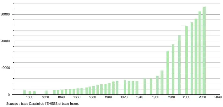 - ↑ Par convention dans Wikipédia, le principe a été retenu de n’afficher dans le tableau des recensements et le graphique, pour les populations de référence postérieures à 1999, que les populations correspondant à une enquête exhaustive de recensement pour les communes de moins de 10 000 habitants, et que les populations des années 2006, 2011, 2016, etc. pour les communes de plus de 10 000 habitants, ainsi que la dernière population de référence publiée par l’Insee pour l'ensemble des communes.
