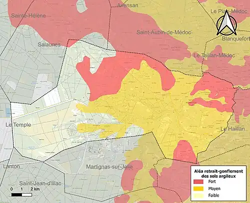Le retrait-gonflement des sols argileux est susceptible d'engendrer des dommages importants aux bâtiments en cas d’alternance de périodes de sécheresse et de pluie. 63,4 % de la superficie communale est en aléa moyen ou fort (67,4 % au niveau départemental et 48,5 % au niveau national). Sur les 10 672 bâtiments dénombrés dans la commune en 2019, 10 652 sont en aléa moyen ou fort, soit 100 %, à comparer aux 84 % au niveau départemental et 54 % au niveau national. Une cartographie de l'exposition du territoire national au retrait gonflement des sols argileux est disponible sur le site du BRGM[24],[Carte 2].