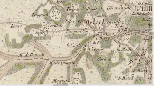- ↑ Les 4 gués sur la Jalle desservant le bourg étaient : le Pas de Jalès, Gajac, Pénide (près du Castérà) et Caupian ; les passants pouvaient, quant à eux, emprunter la passerelle toujours existante (mais privée) sur la façade amont du moulin.